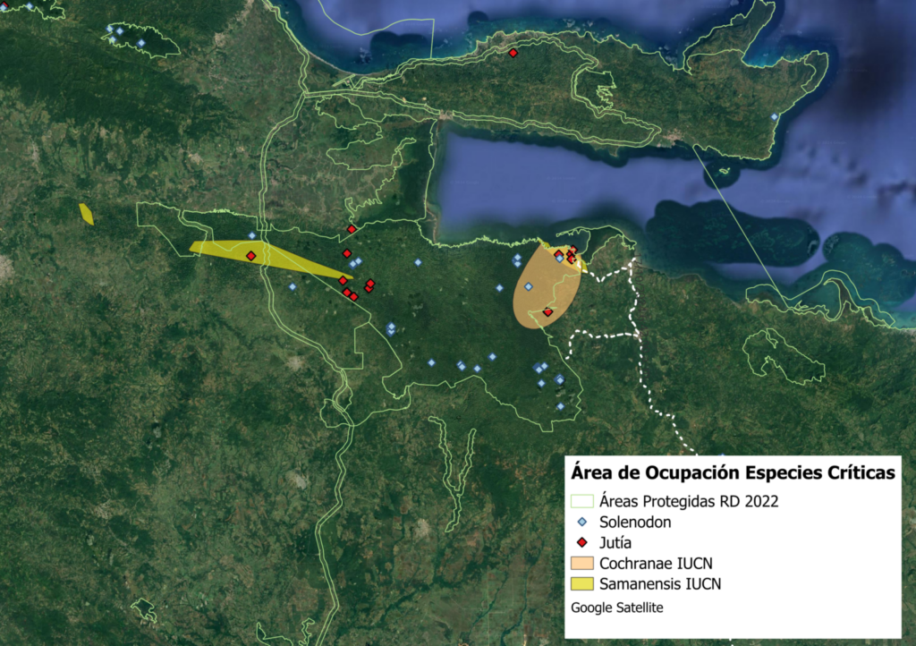Distribución de las cuatro especies de fauna críticas dentro del Parque Nacional Los Haitises